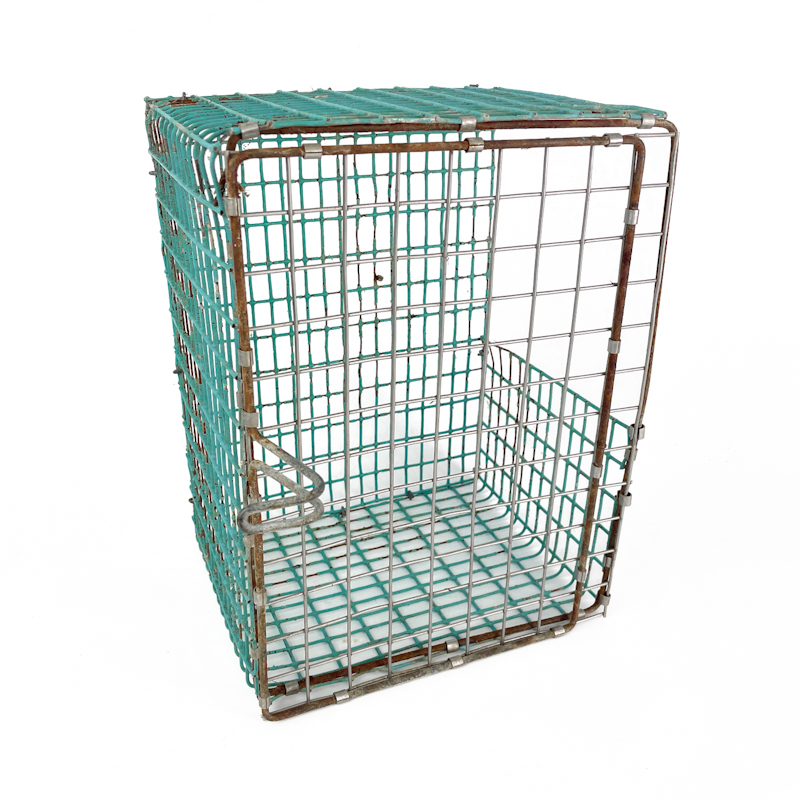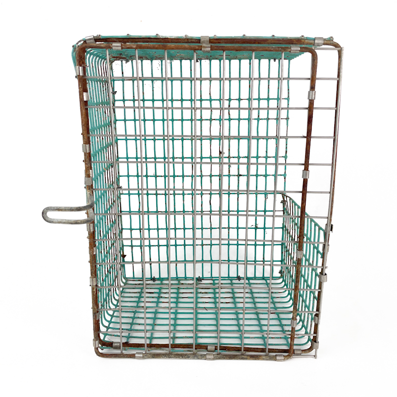 Originalt vintage bur udført i kraftigt metal med rester af turkisgrøn lak og tydelig patina.