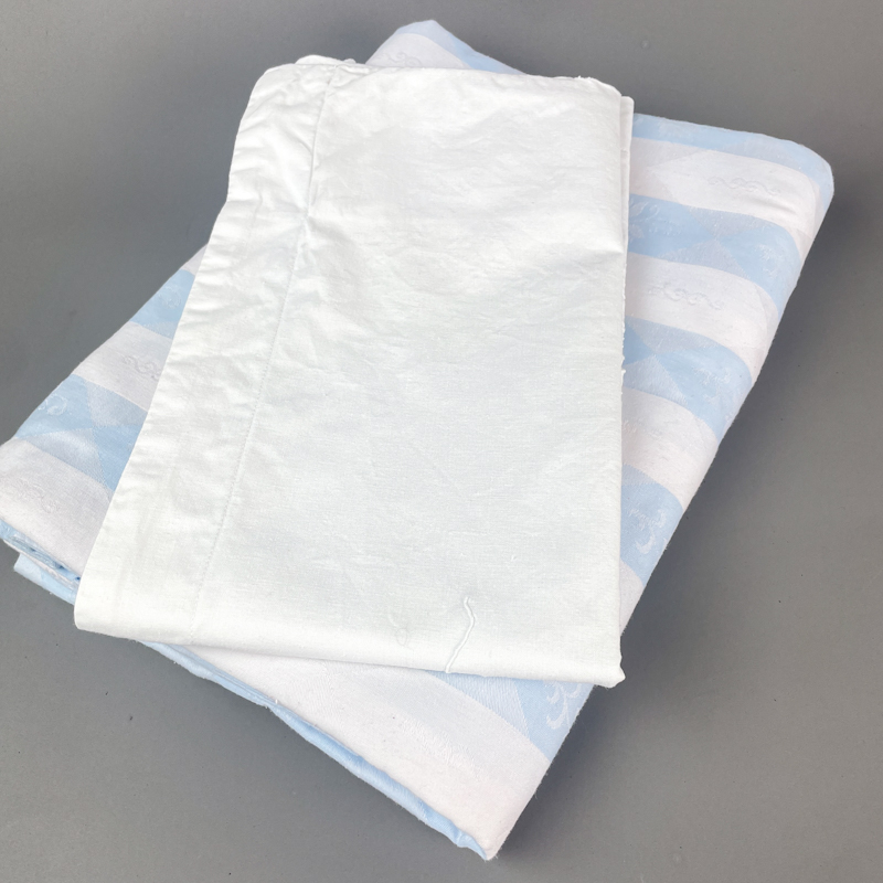 Smukt vintage sengetøj i klassisk stribet damask med diskret vævet mønster i lyse blå og hvid.