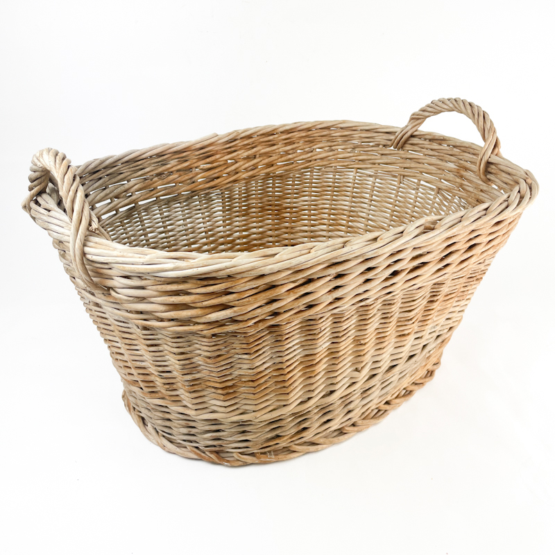Stor vintage vasketøjskurv i kraftigt naturflet med solide, snoede hanke.