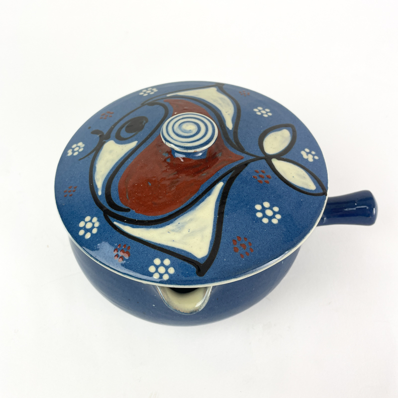 Blå vintage sildekrukke i glaseret fajance med håndmalet dekoration i blå, hvid og rustrød.