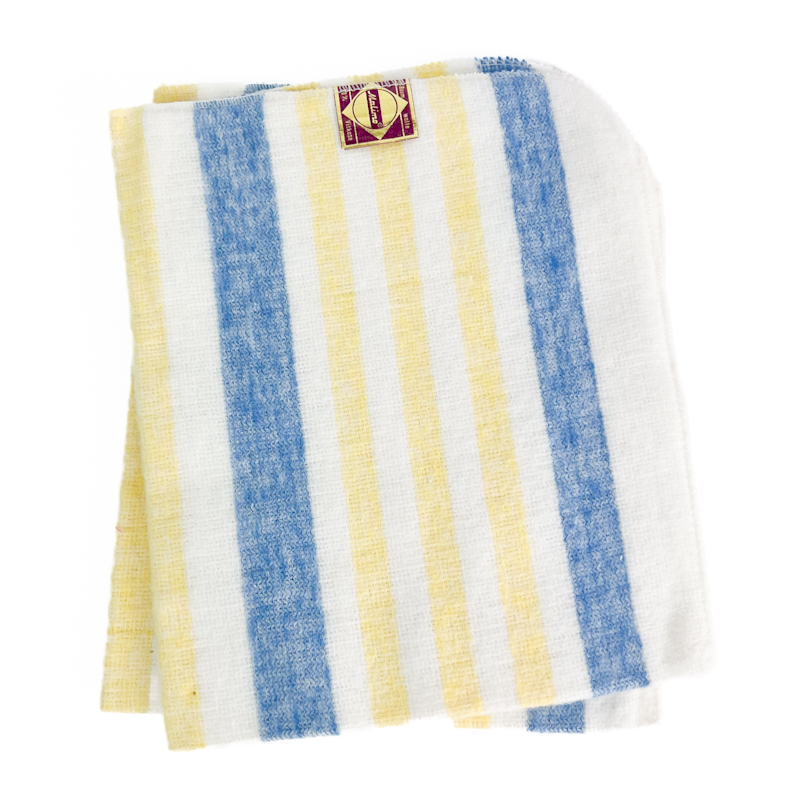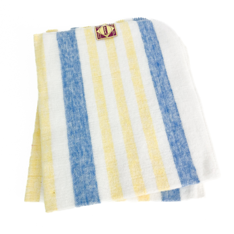 Flotte vintage støveklude i klassisk stribet mønster i hvid, gul og blå.