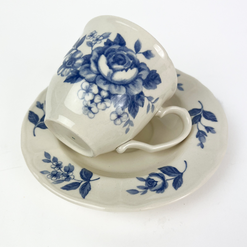 Tekoppen måler ca. 7 cm i højden, og underkoppen måler ca. 14 cm i diameter.