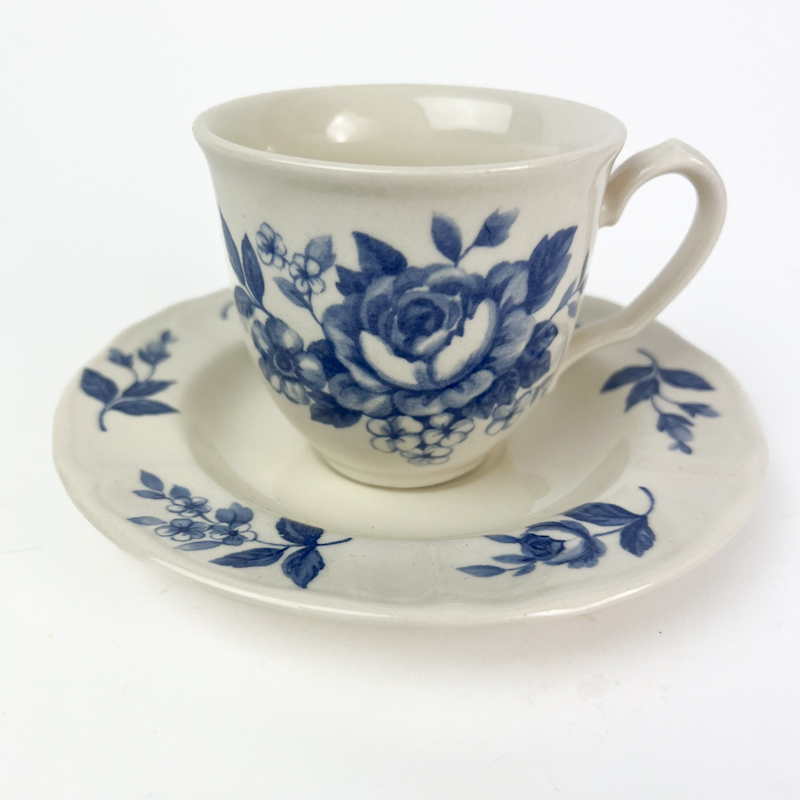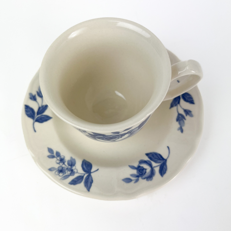 Sættet er udført i porcelæn med fint blåt blomstertryk på råhvid bund.