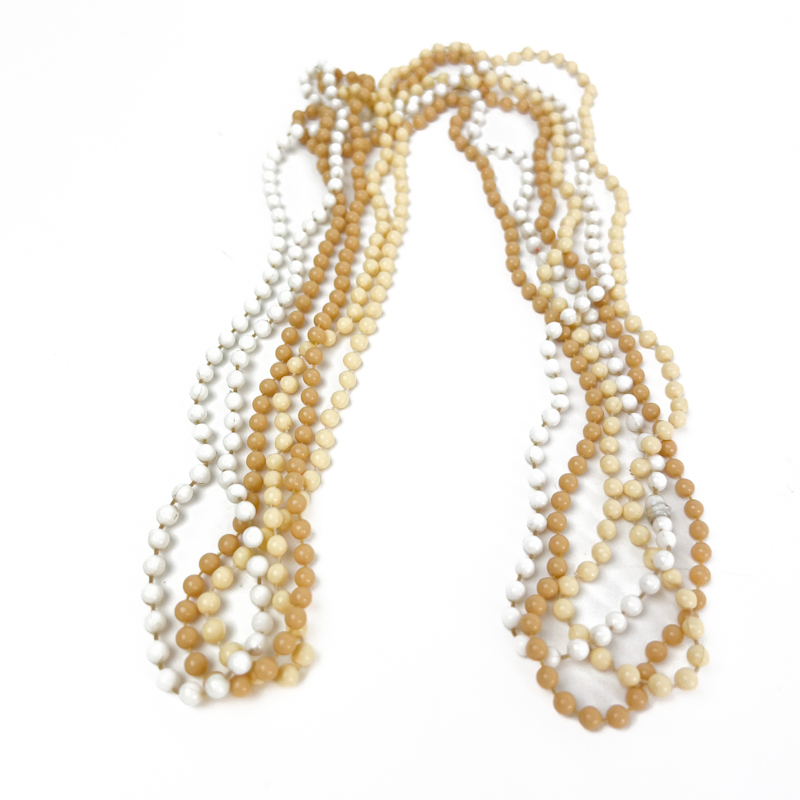 Smukt sæt med tre vintage perlekæder i hvid og beige nuancer.