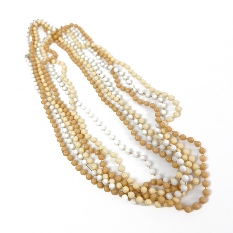 Kæderne er udført i plastperler med jævn form og blank overflade, som giver et klassisk og genkendeligt vintageudtryk.