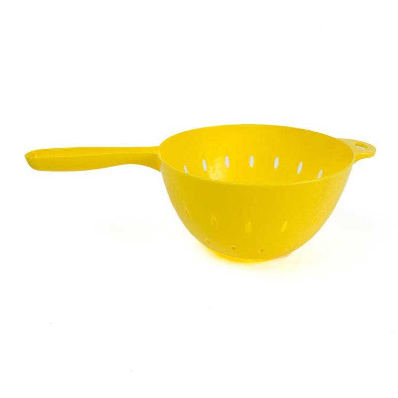 Lille retro dørslag i klar gul farve med klassiske ovale huller og integreret håndtag.