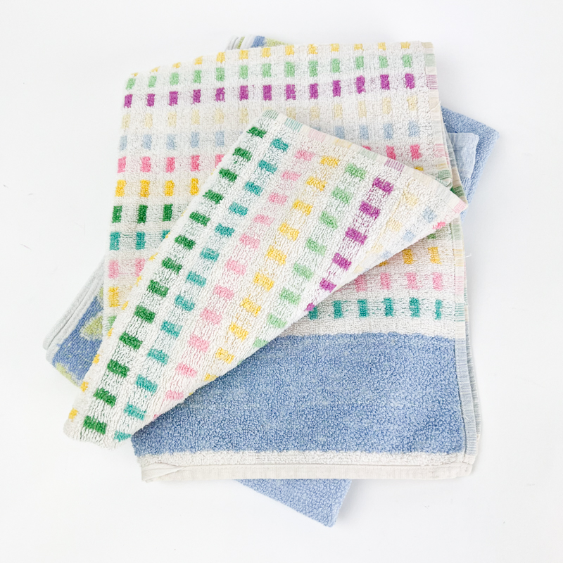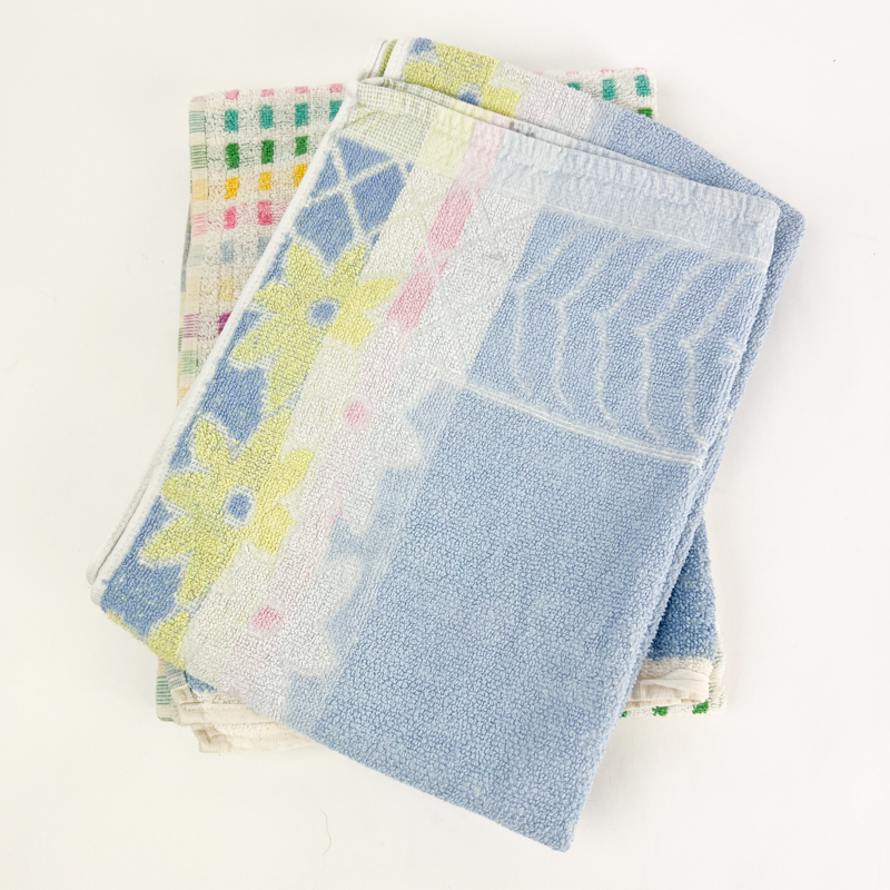 Det ene håndklæde har et grafisk mønster i blå og lyse nuancer.