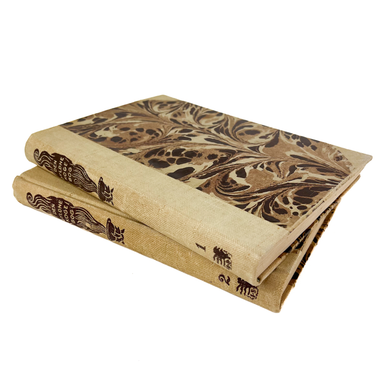 Bøgerne er indbundet med marmoreret papir og lærredsryg med dekorativt tryk og fremstår med flot patina.