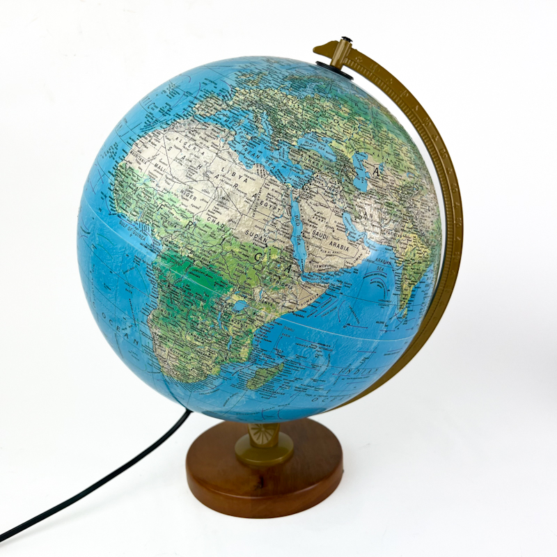 Globen står på fod i trælook med gylden meridian i plast og har sort ledning.