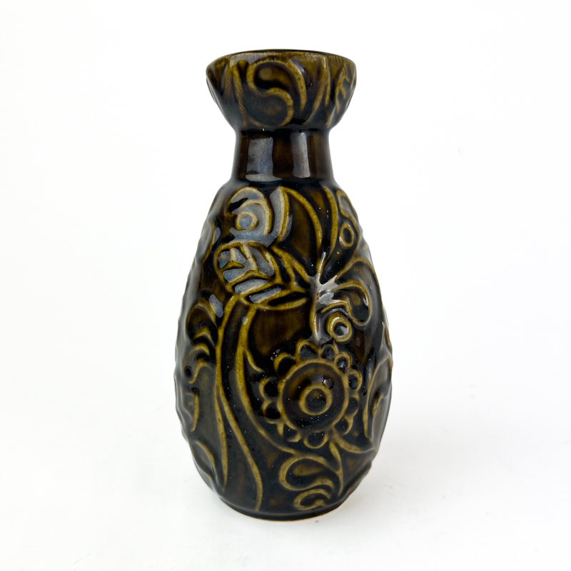 Glasuren er dyb brun med varme gyldne nuancer, som fremhæver det detaljerede mønster og giver vasen et kraftfuldt 60’er udtryk.