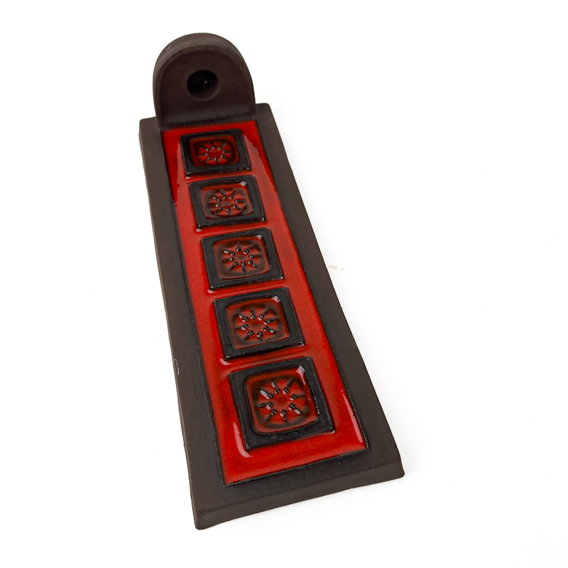 Smuk retro vægstage fra Knabstrup i glaseret stentøj med markant rød midte og mørk brun ramme.