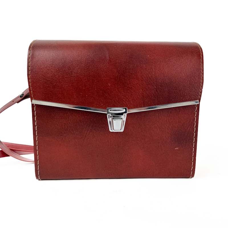 Kikkerten leveres med original rød taske i kunstlæder med skulderrem og metalkliklås.