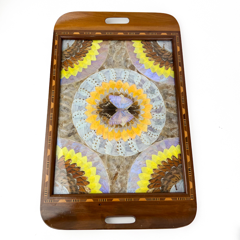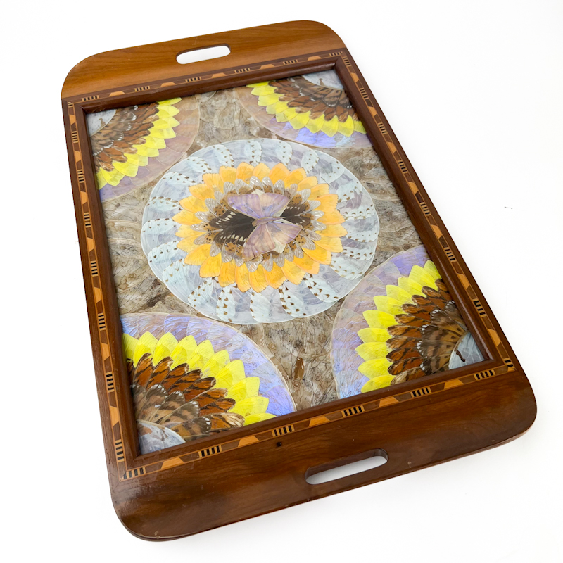 Smuk vintage bakke i massivt træ med dekorativ indlagt kant og glasfelt med kollage af ægte sommerfugle.