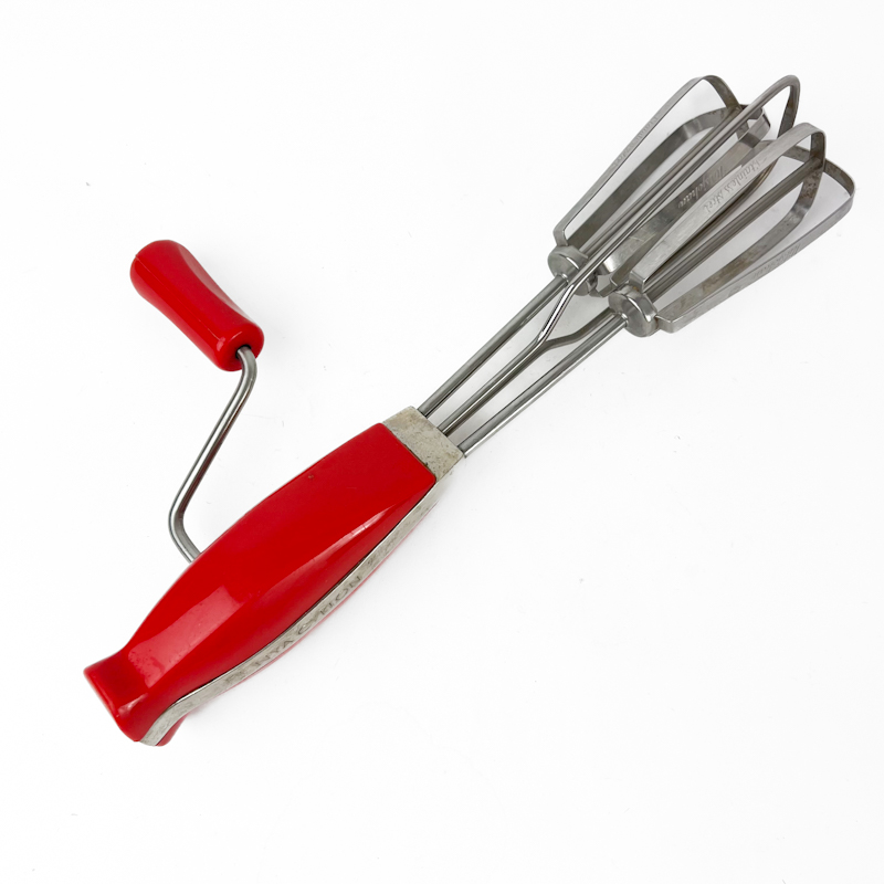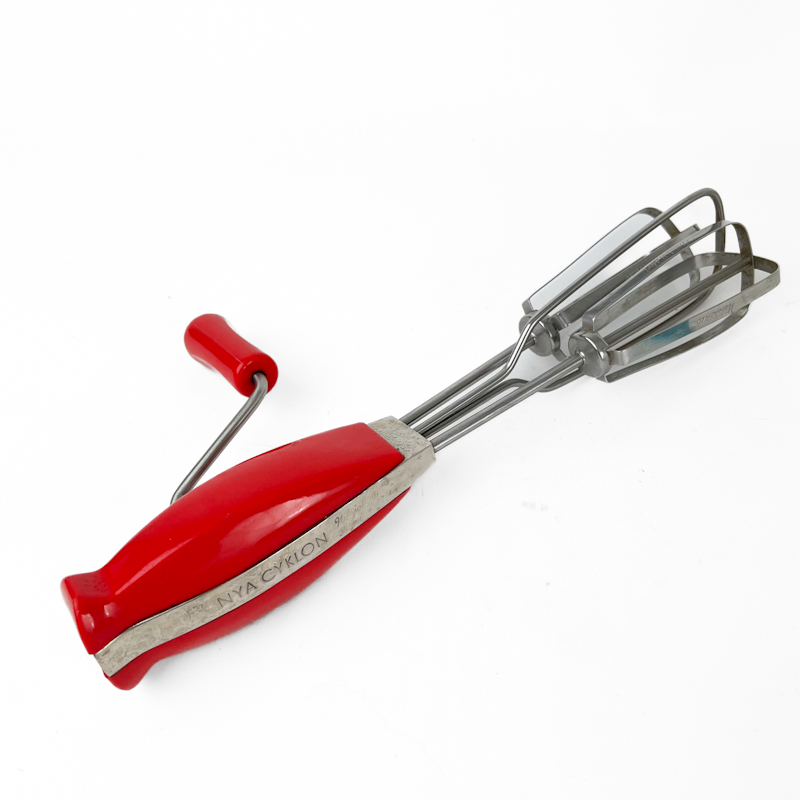 Klassisk vintage håndpisker fra Nya Cyklon med rødt håndtag i hård plast og gearet mekanik.