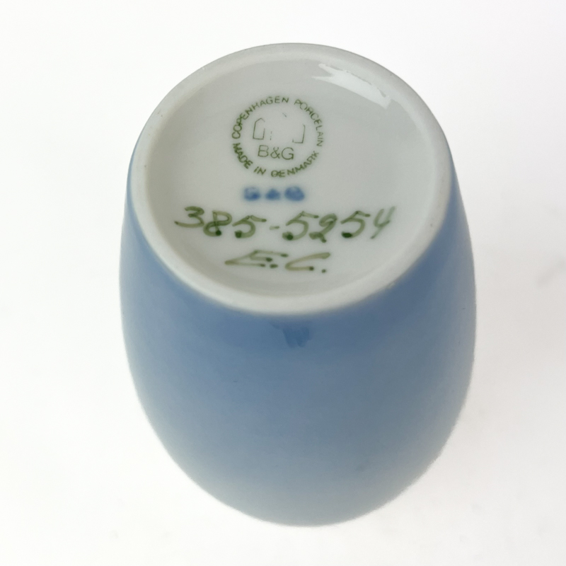 Vasen er fremstillet i porcelæn og bærer det grønne B&G-stempel Copenhagen Porcelain Made in Denmark samt modelnr. 385-5954.
