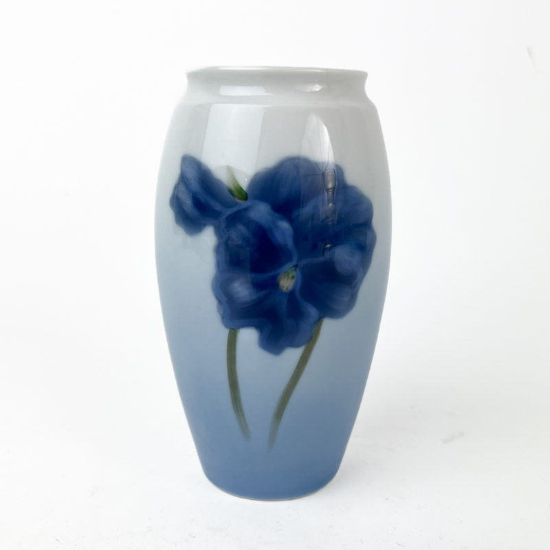 Smuk vintage vase Anemone fra Bing & Grøndahl med håndmalet blå blomst på lys blåtonet bund.