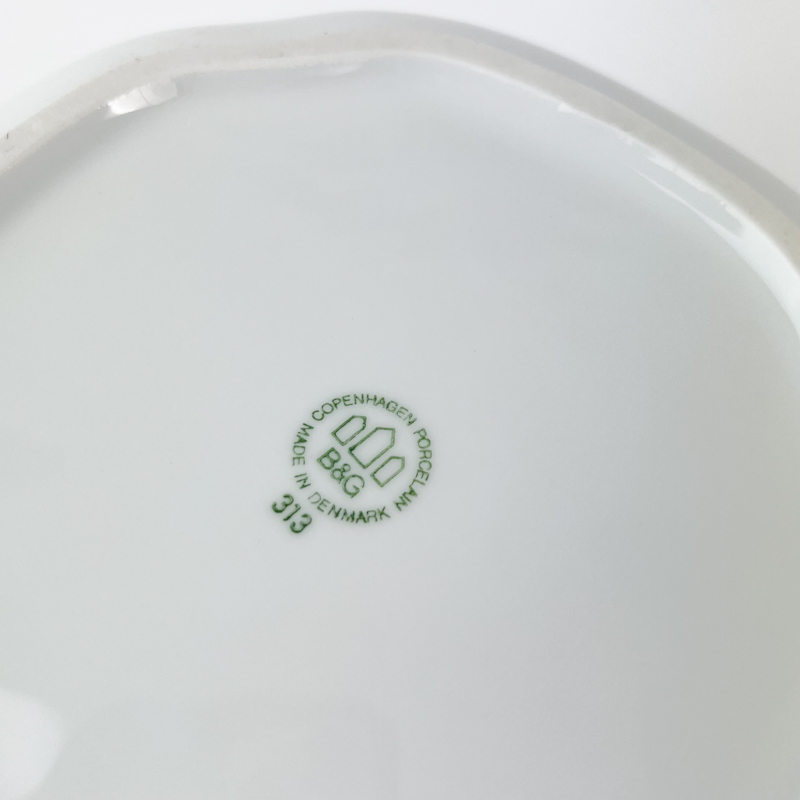 Skålen er fremstillet i porcelæn og stemplet Copenhagen Porcelain Made in Denmark.