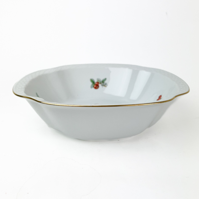 Klassisk hvid porcelæn med diskret relief i kanten, fin gylden staffering og dekor med røde bær og grønne blade.