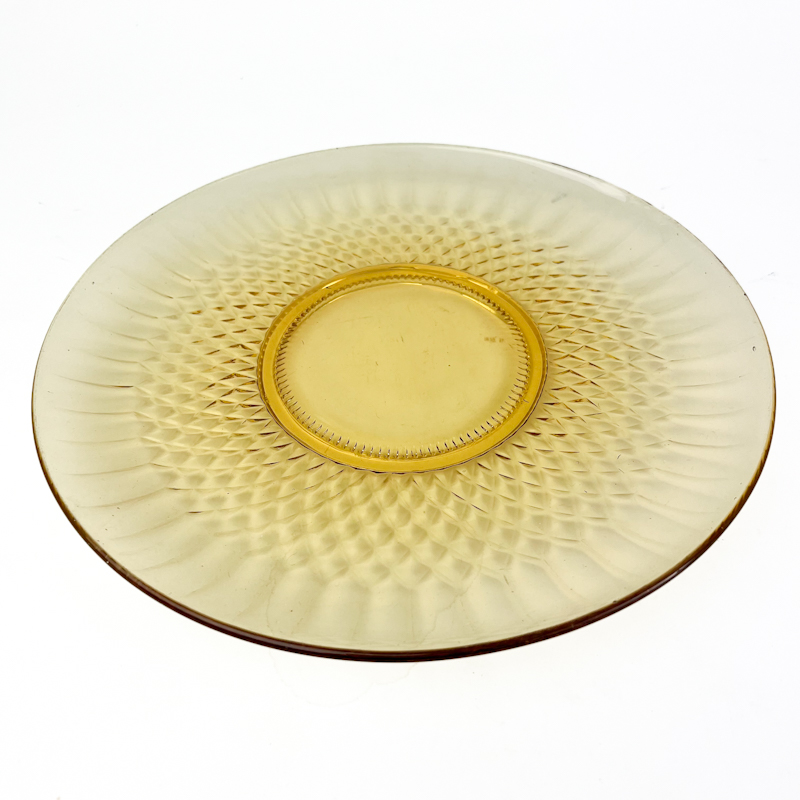 Smukt vintage lagkagefad i gyldent presset glas med markant diamantmønster.