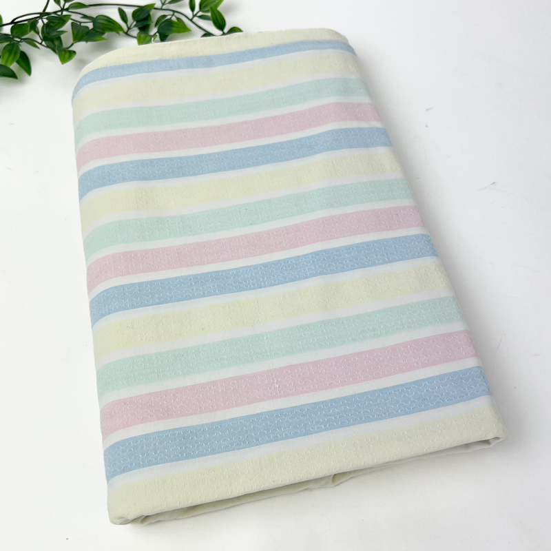 Smukt vintage sengetøj i bløde pastelfarver med striber i rosa, lyseblå, mint og lys gul.