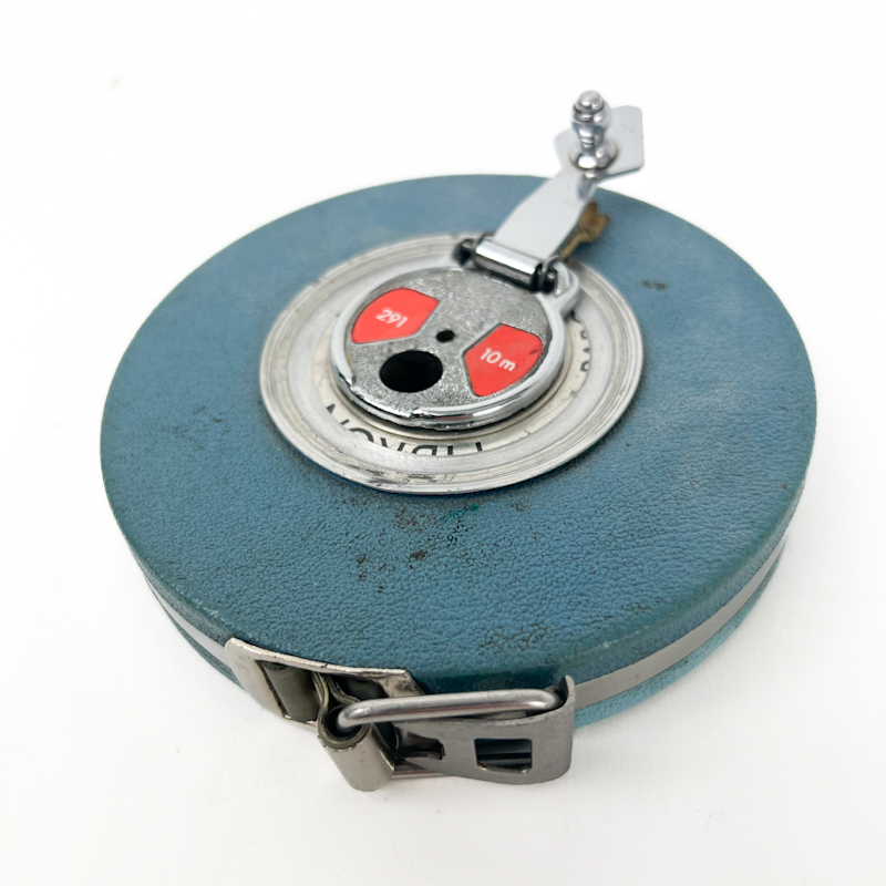 Originalt vintage målebånd i blå metal med klassisk rundt design og mekanisk oprul.