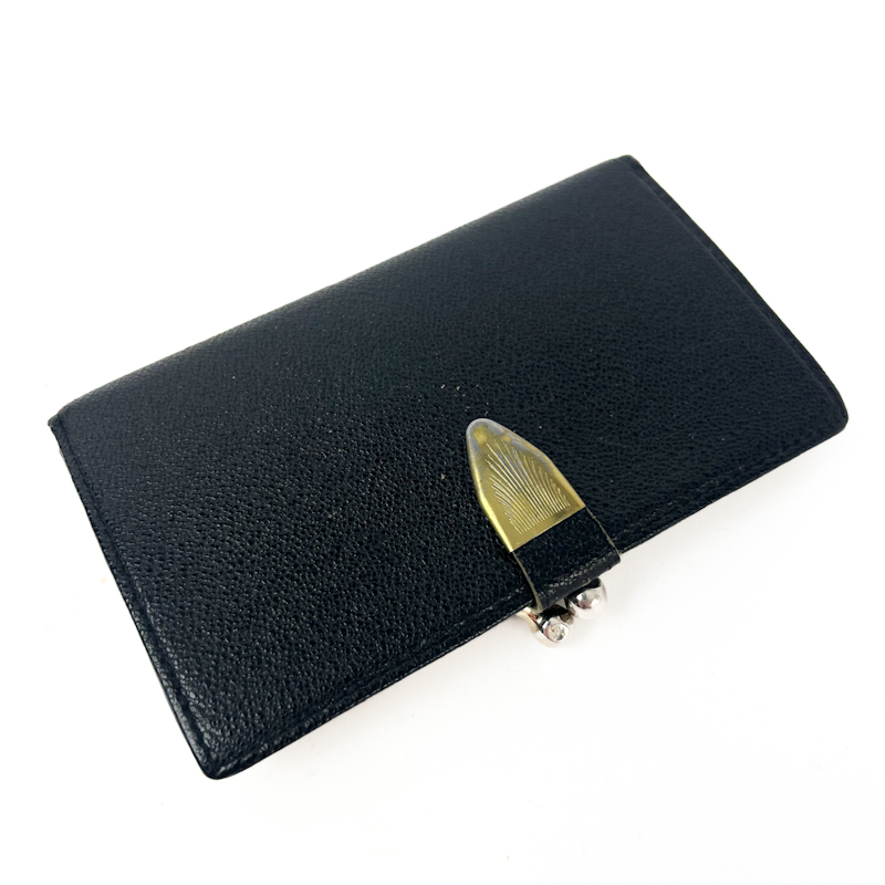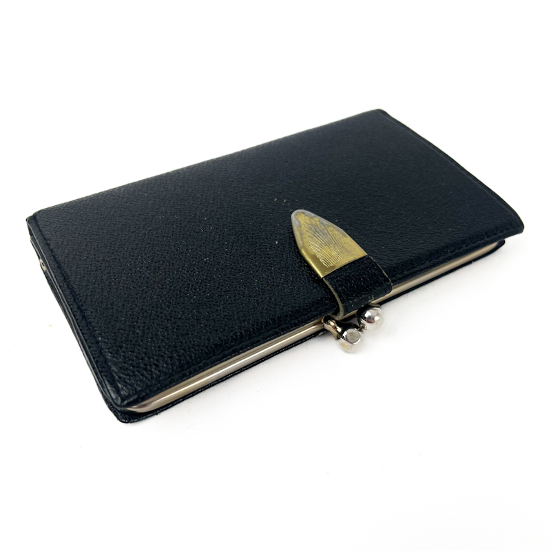 Elegant vintage pung i sort skind med dekorativ gylden frontdetalje og klassisk kuglelukning i metal.