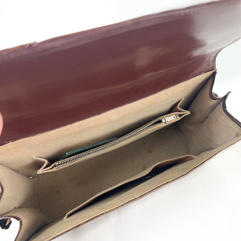 Elegant vintage håndtaske i ægte skind med markant krokopræget overflade og flot varm brun farve.