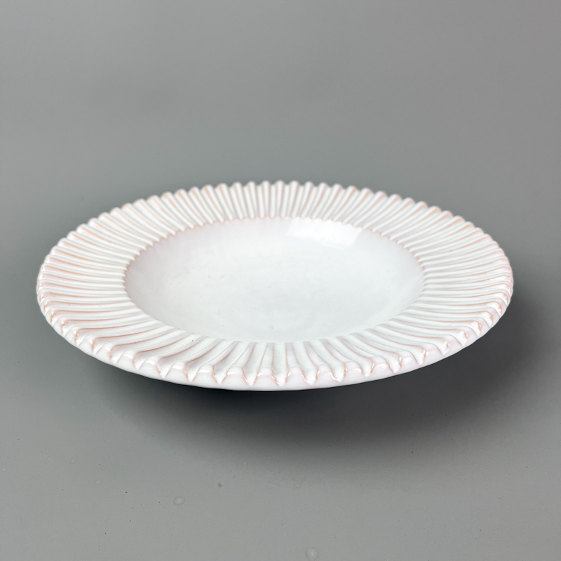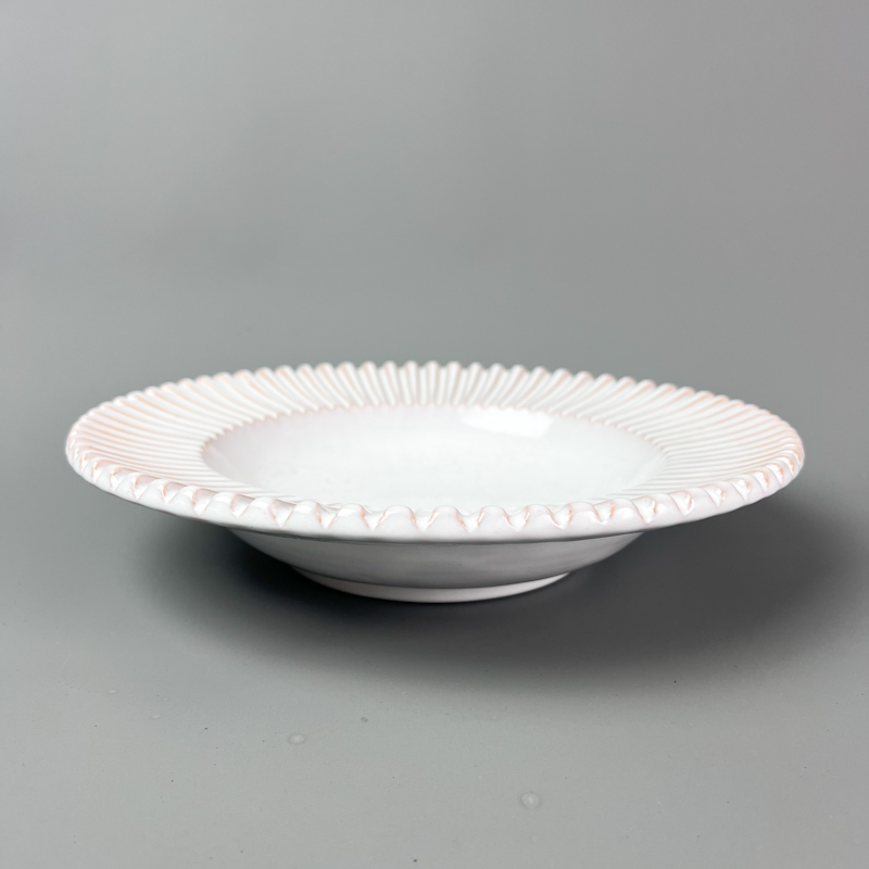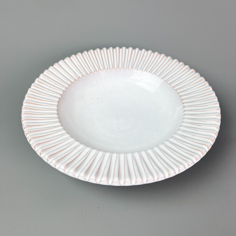 Skålen er fremstillet i glaseret keramik i hvid nuance, og den karakteristiske rillede kant giver et dekorativt og genkendeligt udtryk.