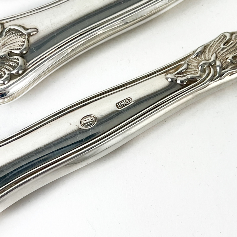 Skaftet er udført i sølv og stemplet COHR samt tre-tårnet, hvilket dokumenterer ægte dansk sølv.
