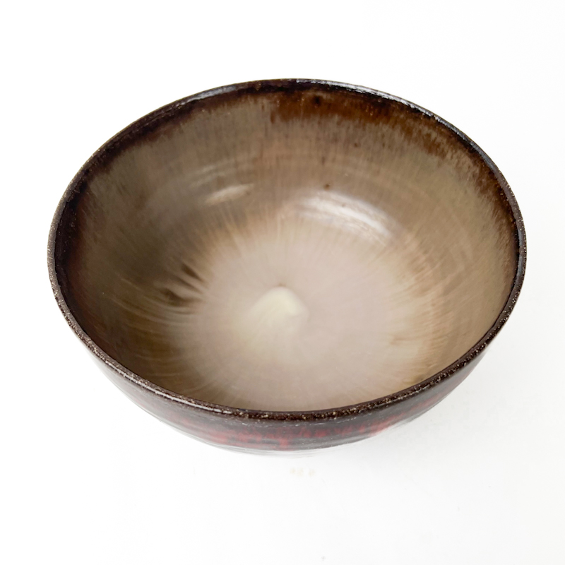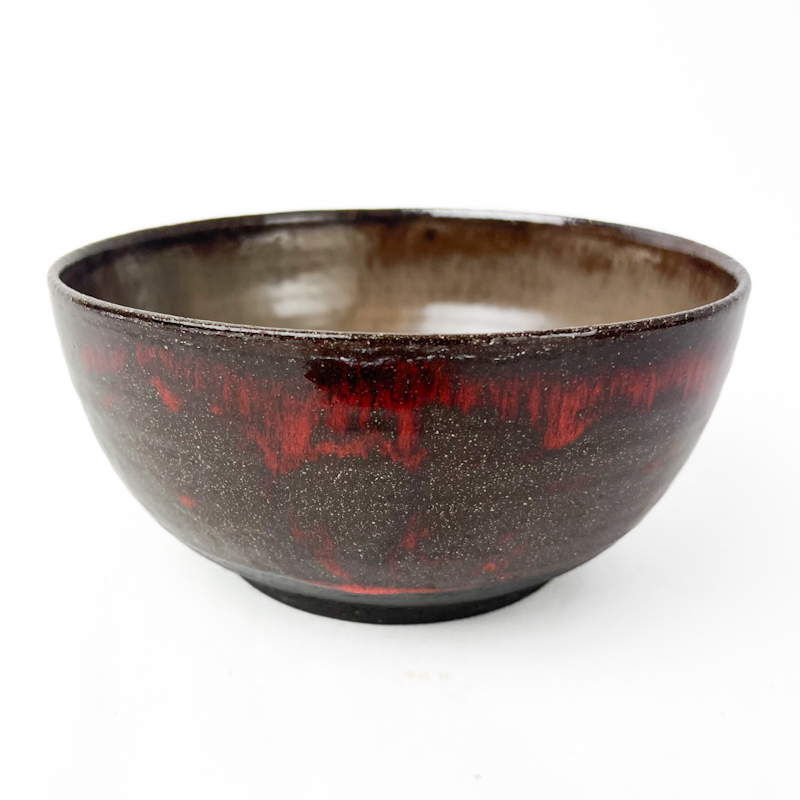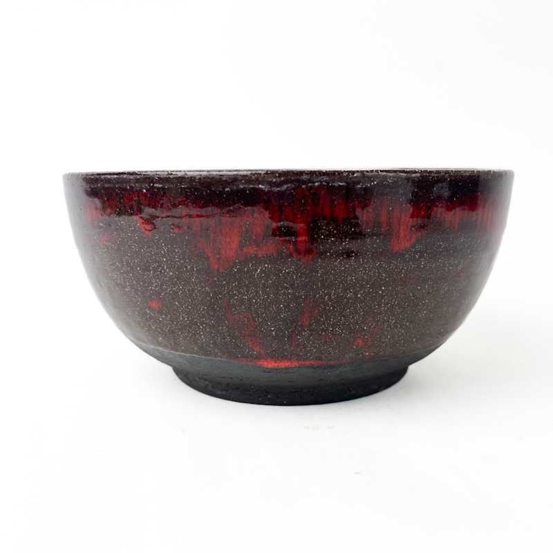 Smuk vintage skål fra Enøe Keramik udført i kraftigt stentøj med dyb rød og mørk glasur, der flyder levende ned over den mørke bund.