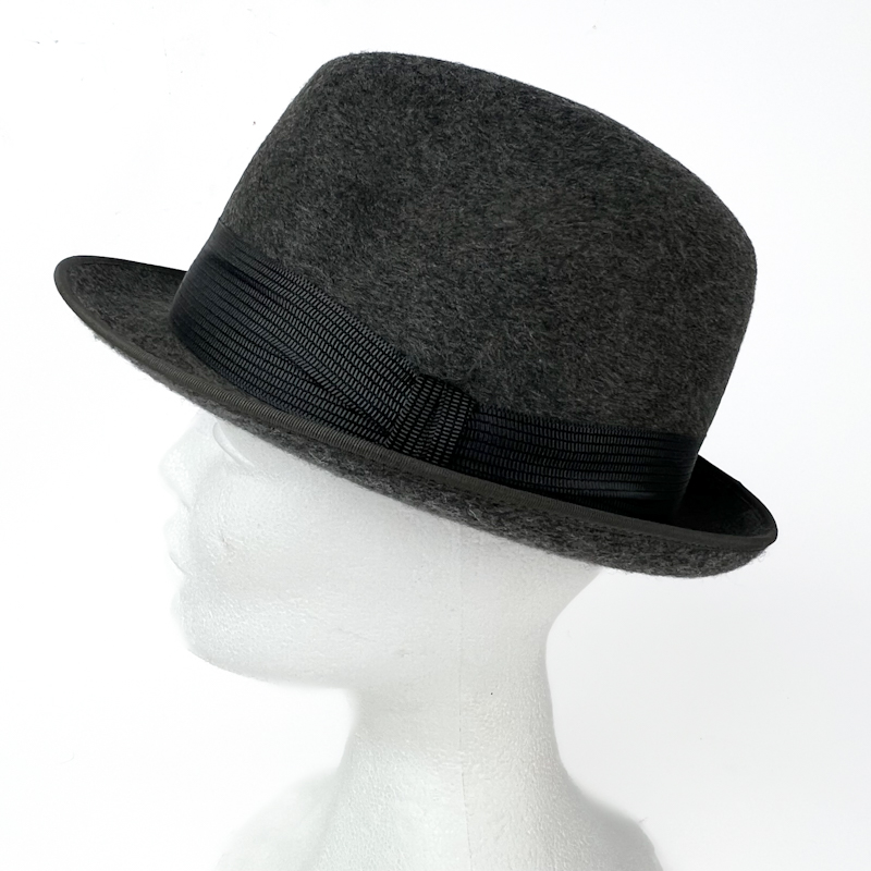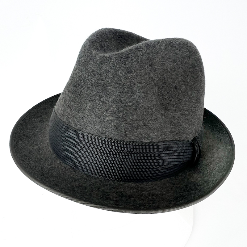 Klassisk vintage fedora i meleret grå filt med sort grosgrainbånd.