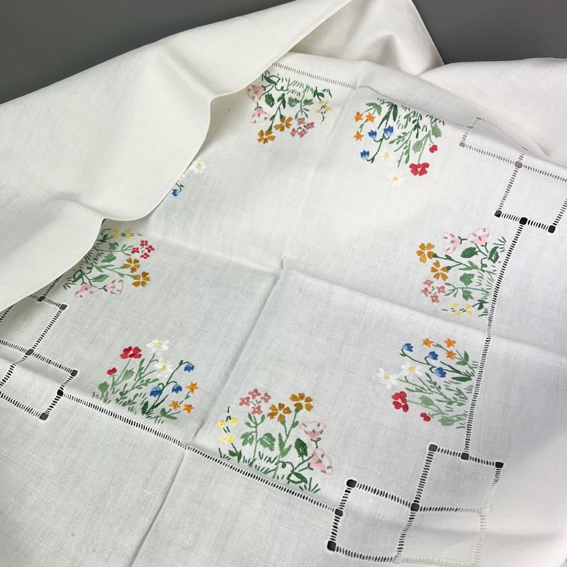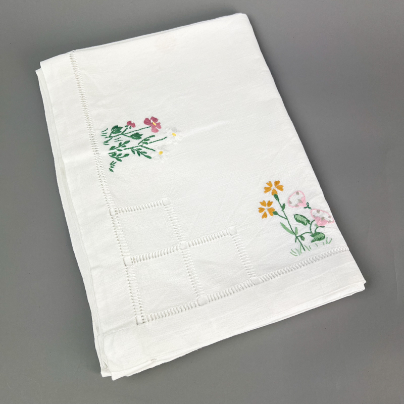 Smuk vintage dug i hvid ren bomuld med fint farverigt blomsterbroderi og dekorativt mellemværk i hjørnerne.