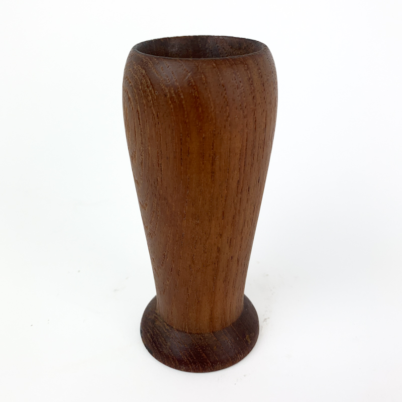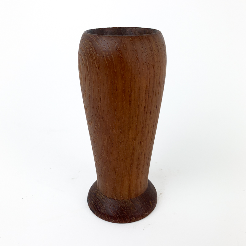Vasen er drejet i teak med en elegant konisk form og en varm, gyldenbrun træglød med tydelig åretegning.