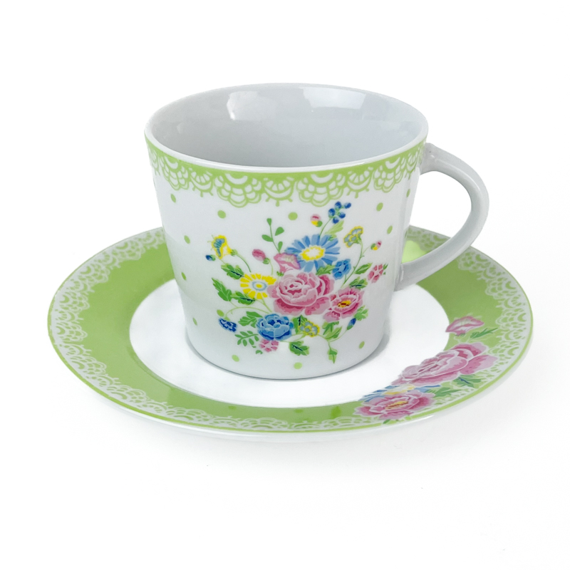 Koppen er dekoreret med et farverigt blomstermotiv i rosa, blå og gule nuancer samt en karakteristisk limegrøn bort med små grafiske detaljer.