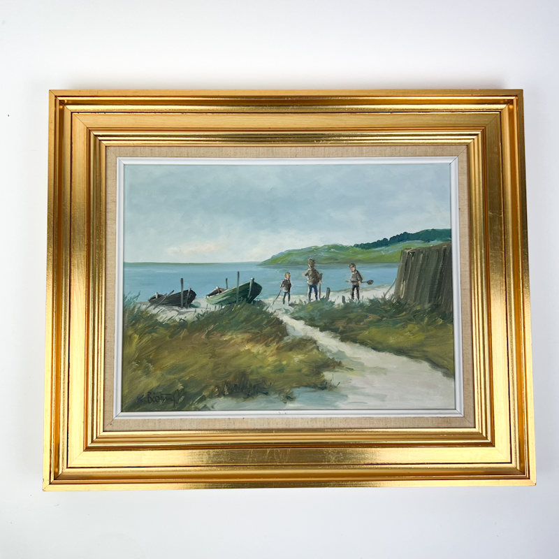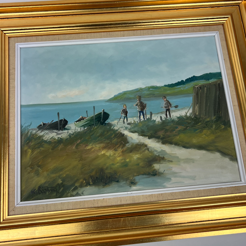 Motivet viser en rolig dansk kyst med små både på stranden og tre børn på vej ned mod vandet. Farverne er bløde og naturlige med fine blå og grønne nuancer i hav, klitter og himmel.