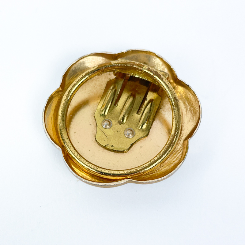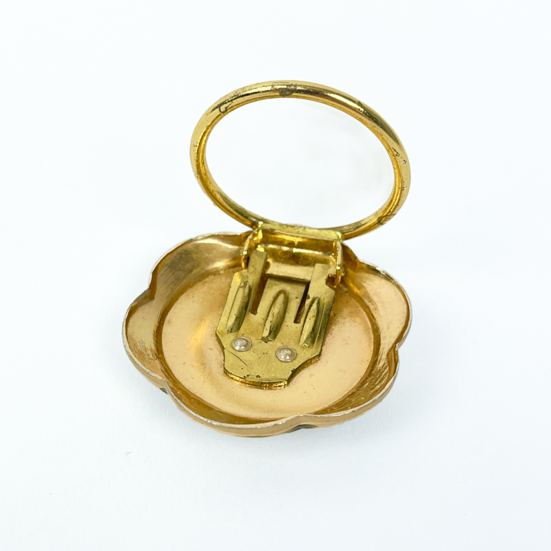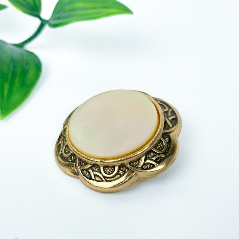 Smuk vintage tørklædering i gyldent metal med dekorativ gennembrudt kant og rund perlemorsfarvet indsats.