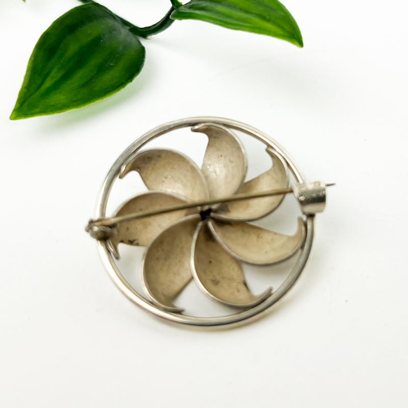 Elegant vintage broche i sølv formet som en stiliseret blomst med seks buede kronblade og kugle i midten.
