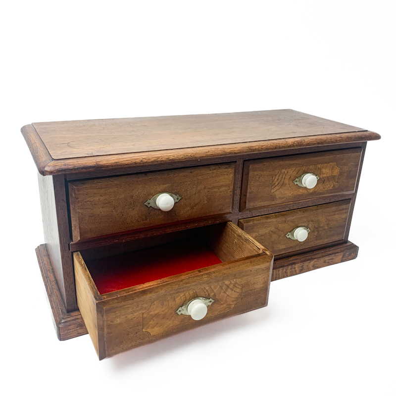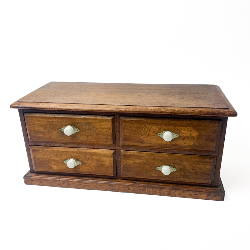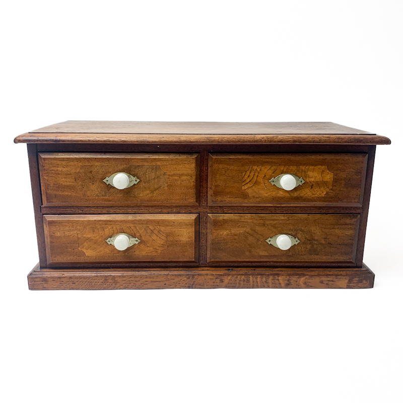 Fin antik kommode i træ med fire små skuffer og klassiske porcelænsgreb.
