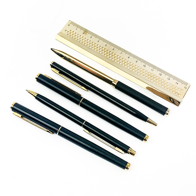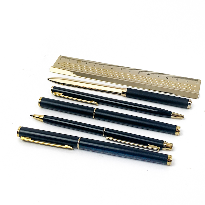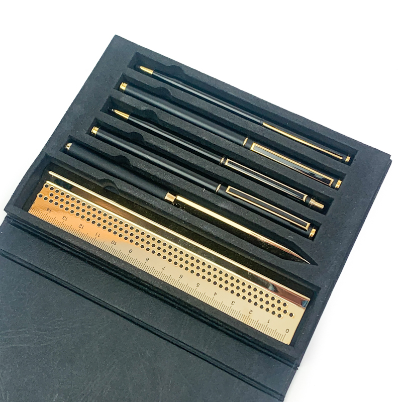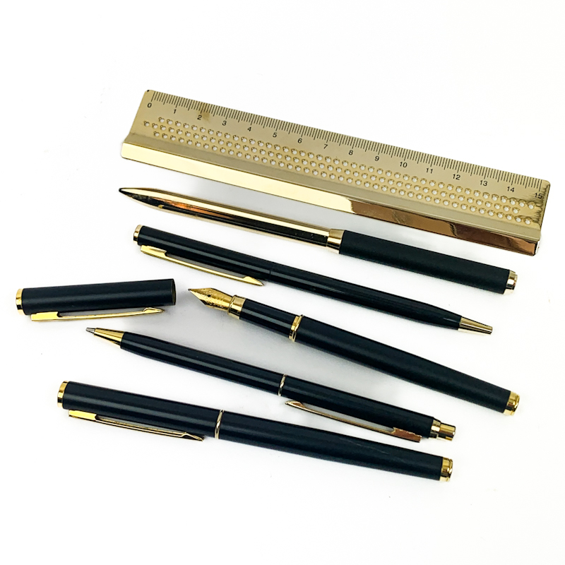 Der medfølger også brevåbner og lineal i gylden metal, som fuldender sættet.