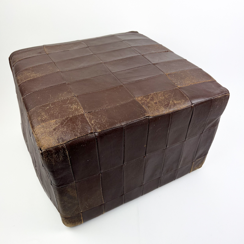 Mørk vintage læderpuf patchworkFlot vintage puf beklædt med mørkt læder i klassisk patchwork af små kvadratiske læderstykker.