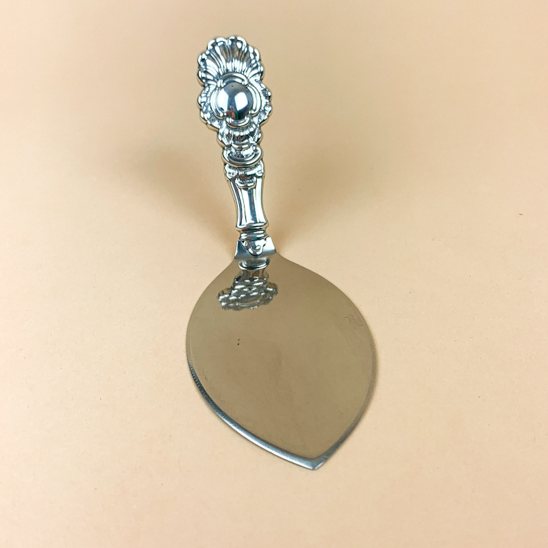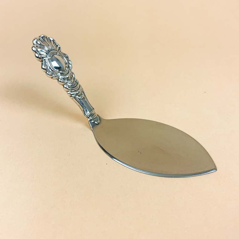 Virkelig smuk kagespade med ornamenteret skaft i sølv fra Tretårnet.