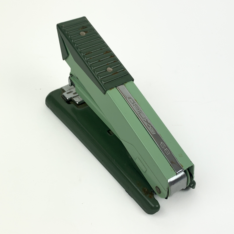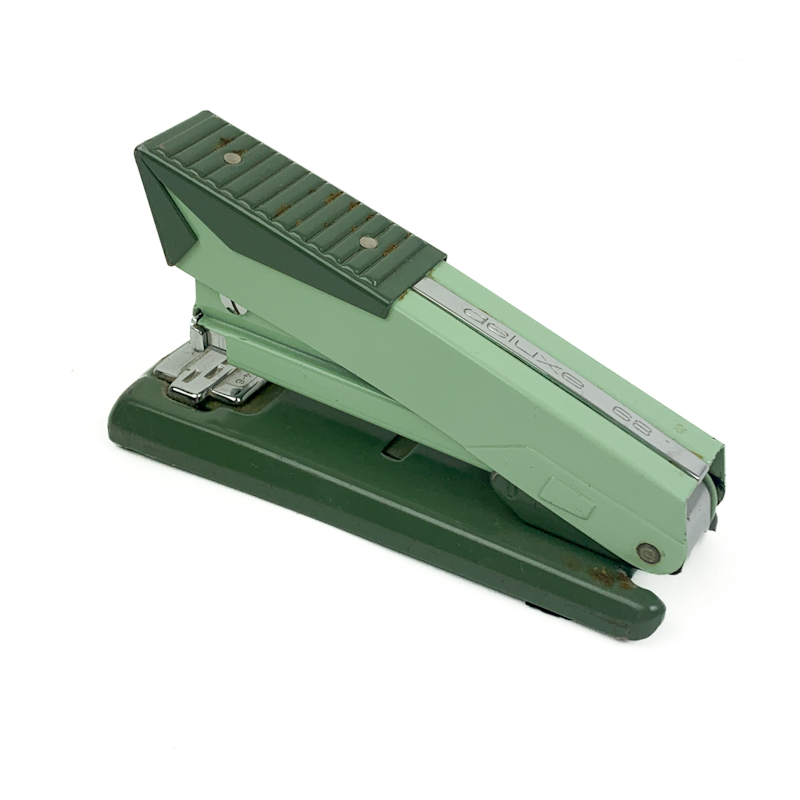 Fin vintage hæftemaskine i metal i to grønne nuancer.