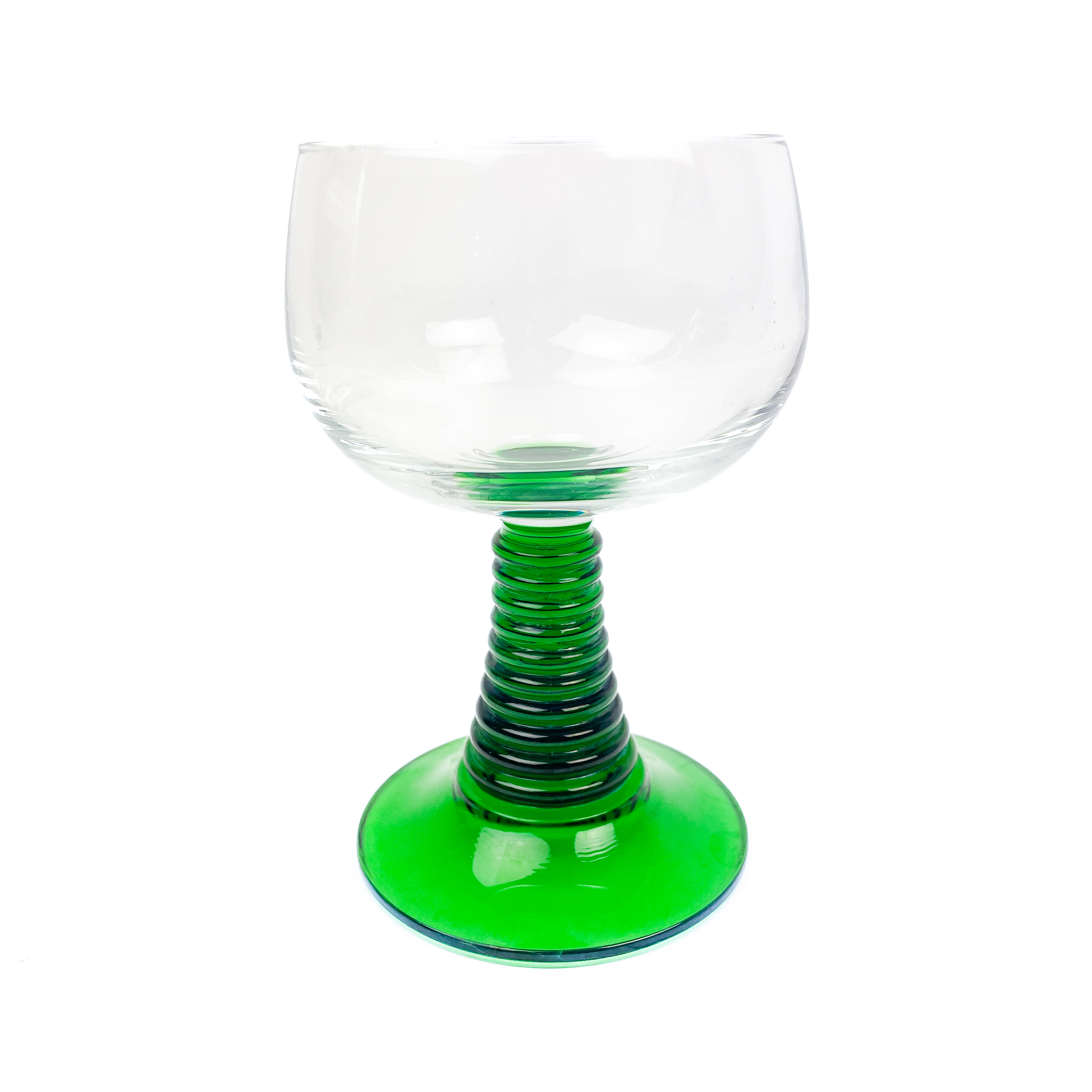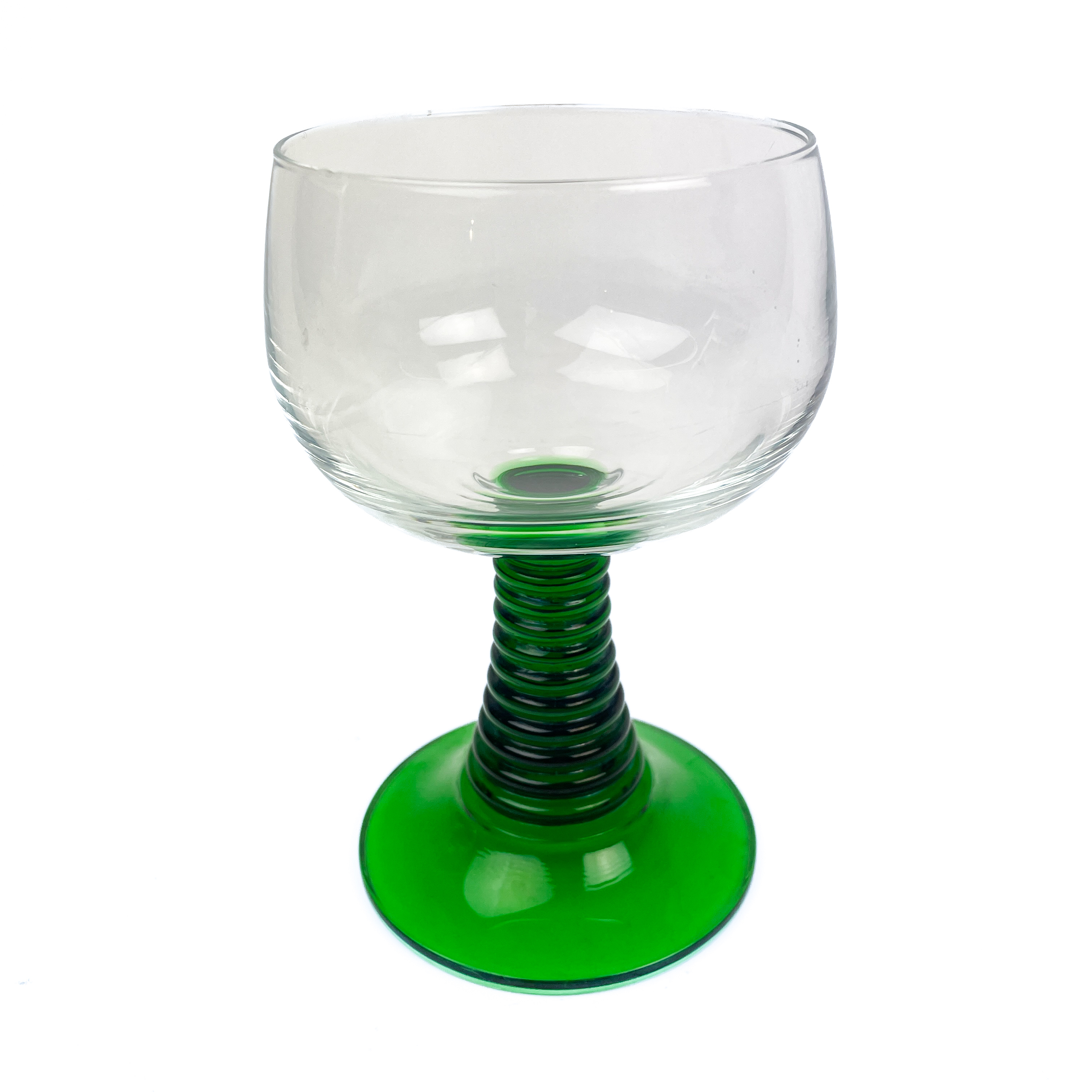 Smukt vintage vinglas i glas med klar kumme og grøn stilk og fod i klassisk Römer-stil.