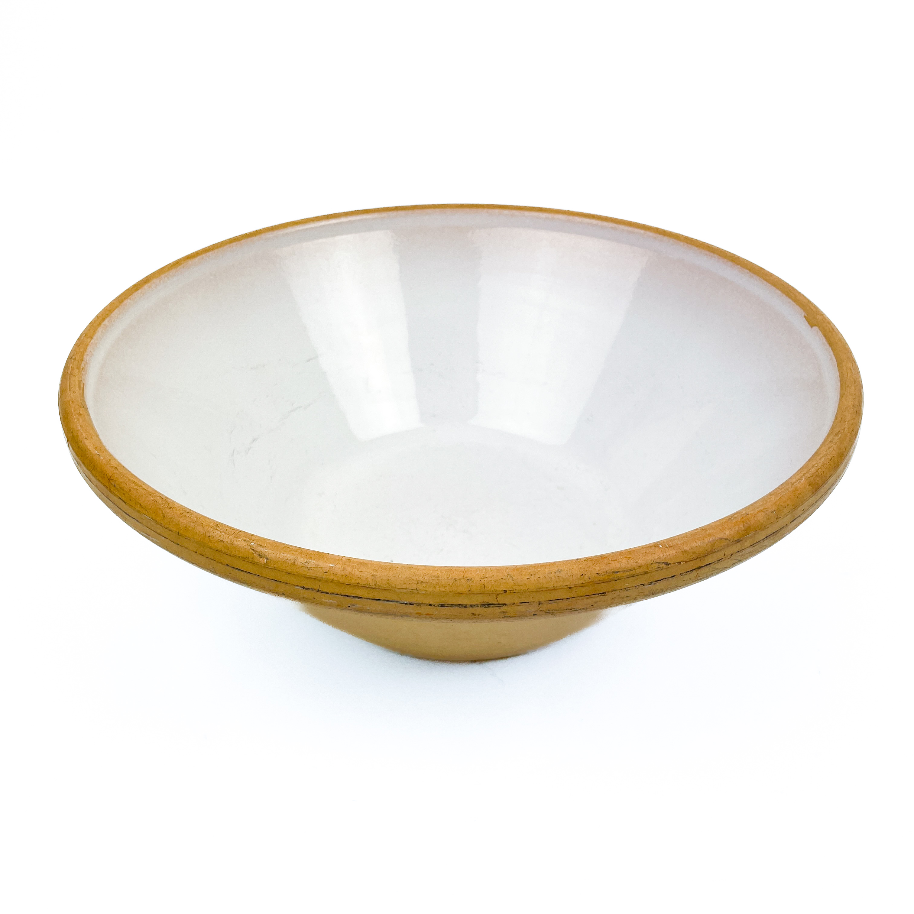 Stort vintage dejfad i kraftigt ler med hvid glasur indvendigt og lys kant.
