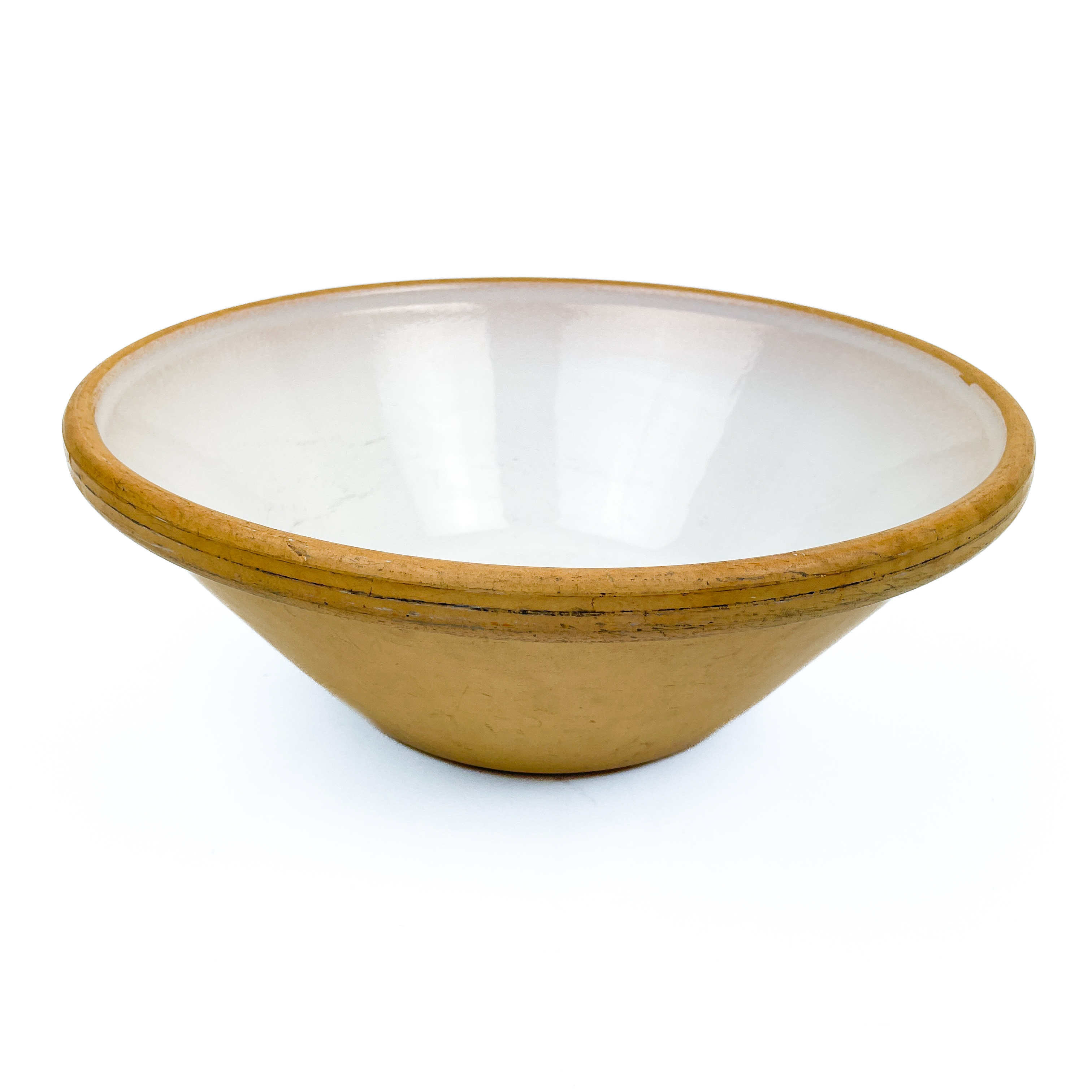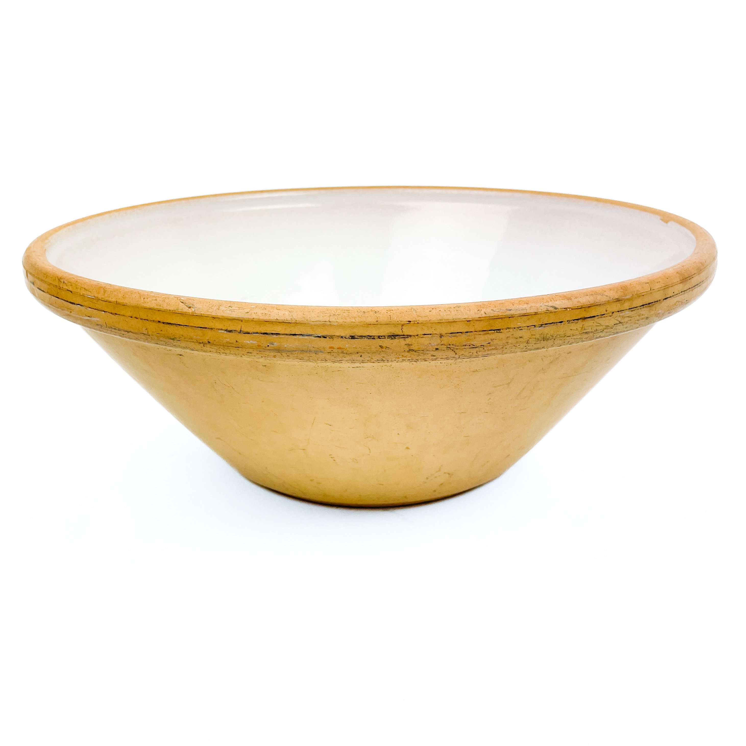 Fadet har en bred rund form med kraftig kant og fine mørke linjer langs randen, som er typisk for ældre køkkenkeramik.