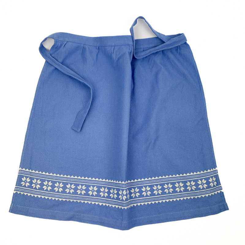 Flot vintage forklæde i kraftig bomuld med klar blå farve og vævet bort med hvide blomster.