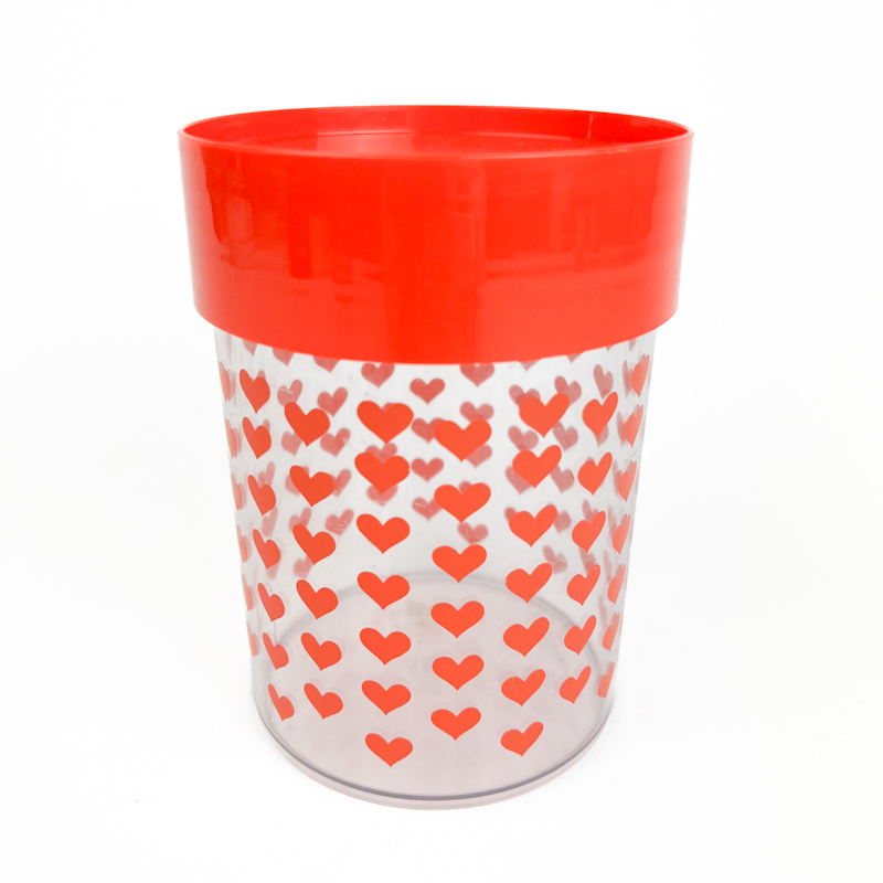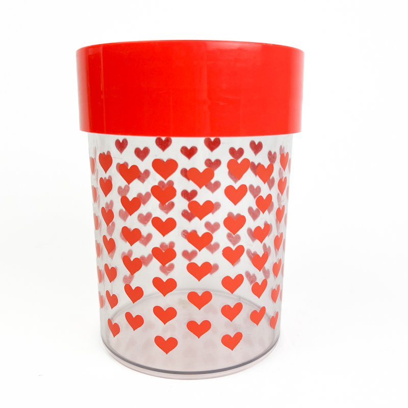 Bøtten er fremstillet i plast med transparent side og hjertemønster, typisk for 70’ernes køkkendesign. Den måler ca. 12 cm i diameter og ca. 17 cm i højden. Fremstår i virkelig flot stand uden skader.