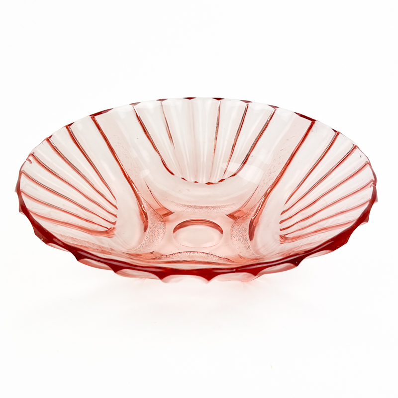 Rosa vintage glasskål i støbt glas med elegant rillet mønster og bølget kant.