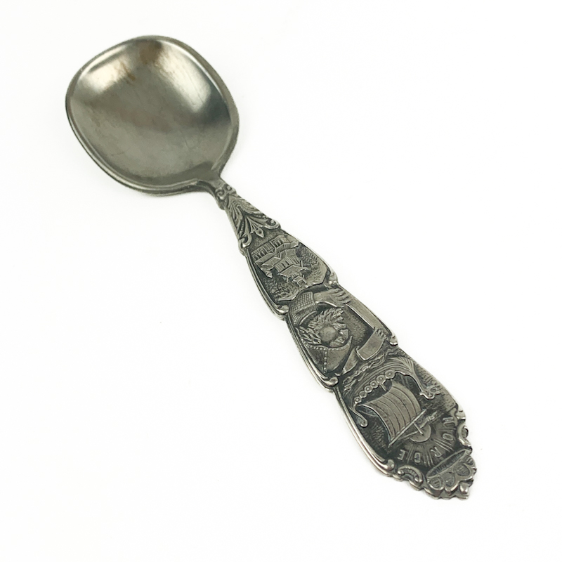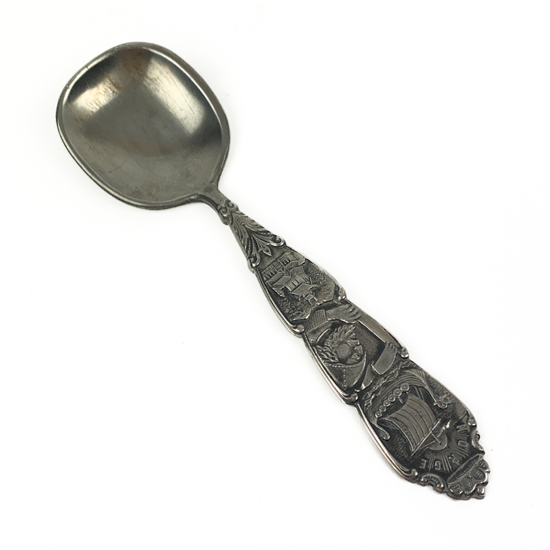 Dekorativ vintage ske i tin med detaljeret relief og klassiske motiver på skaftet.