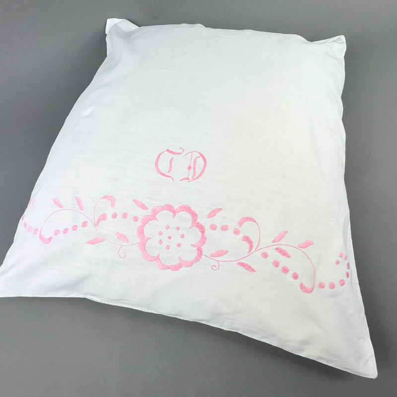 Smukt vintage pudebetræk i hvid ren bomuld med lyserødt broderi og monogram.
